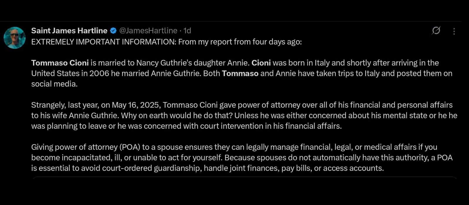 Some netizens suspect Tommaso Cioni's power of attorney to have something to do with the recent allegations of his involvement in Nancy Guthrie's disappearance. Their views are primarily shaped by the timing of the document's surfacing. However, official sources and legal experts have clarified that the document is not linked to the criminal investigation. Even some online users defended Tommaso, saying, "He named Annie as his agent for purposes of the listed property only. It is very common and used all the time in real estate and other transactions." Another wrote, "No big deal. This was just used for a mortgage loan closing between him and Annie."
