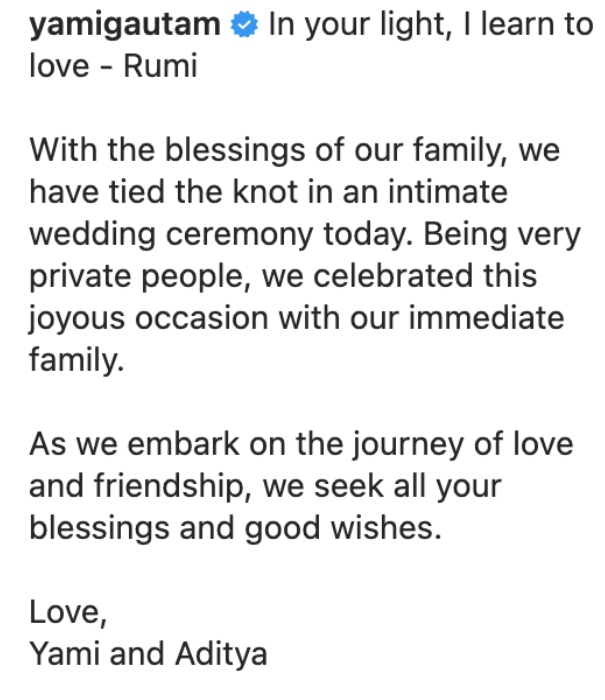 Alongside the picture, Yami shared a quote on love by Rumi and revealed that she tied the knot in the presence of her close family. Her note can be read as "In your light, I learn to love - Rumi. With the blessings of our family, we have tied the knot in an intimate wedding ceremony today. Being very private people, we celebrated this joyous occasion with our immediate family. As we embark on the journey of love and friendship, we seek all your blessings and good wishes. Love, Yami and Aditya."