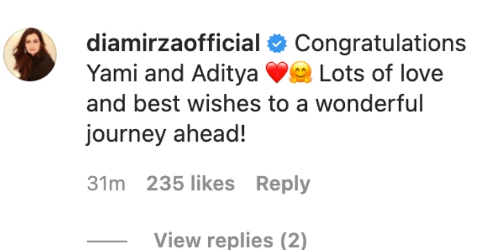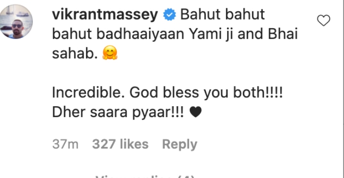 Soon her friends from the industry flooded her comments section with wishes. Actor, Vikrant Massey wrote, "Bahut bahut bahut badhaaiyaan Yami ji and Bhai sahab. Incredible. God bless you both!!!! Dher saara pyaar!". Dia Mirza also shared her wishes and commented, "Congratulations, Yami and Aditya. Lots of love and best wishes to a wonderful journey ahead!"
