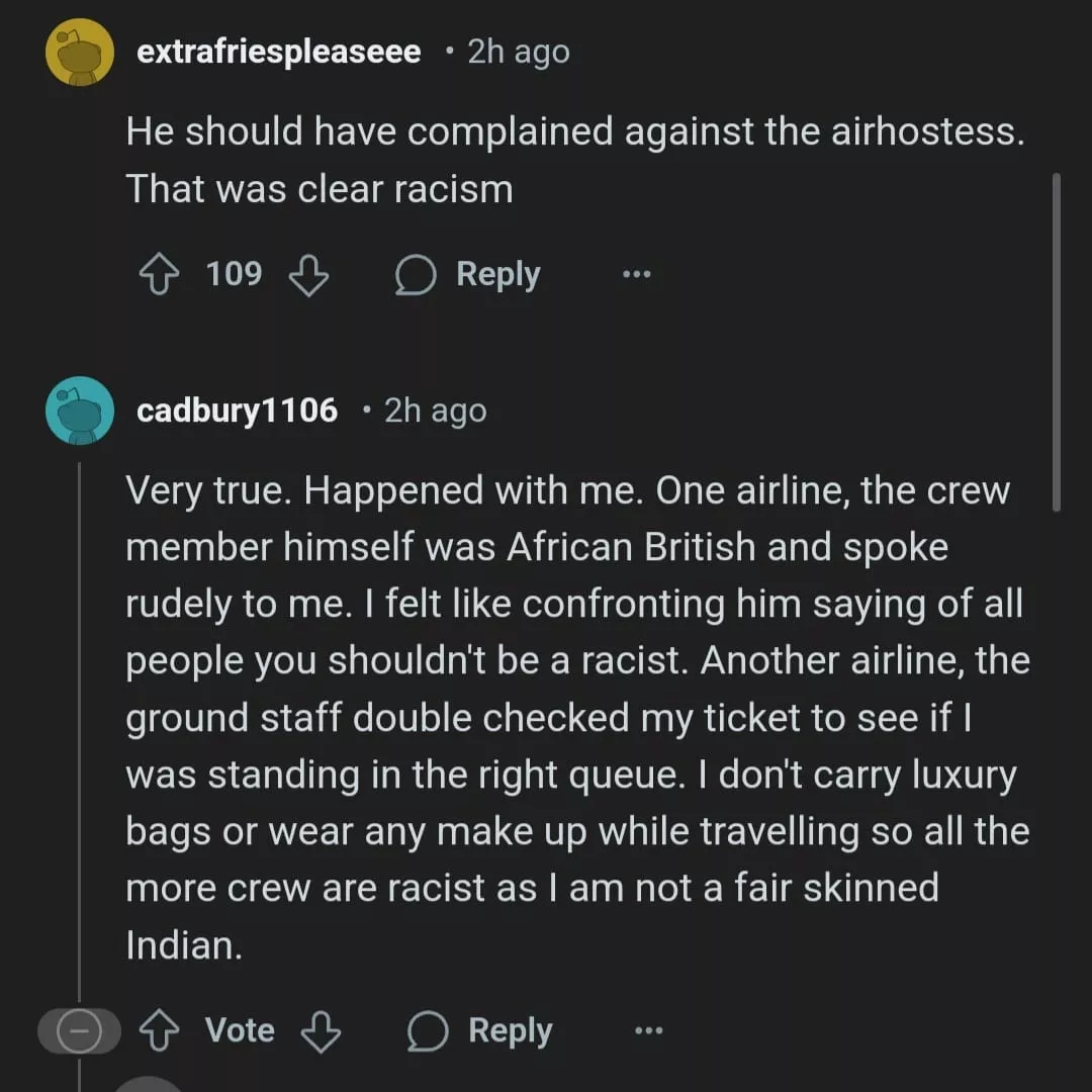 "This air hostess held my hand and turned it to see whether I was flying first class or not. But at the same time, there was also this old white lady who was trying to stop me from doing that (keeping his luggage). It was all happening at the same time."