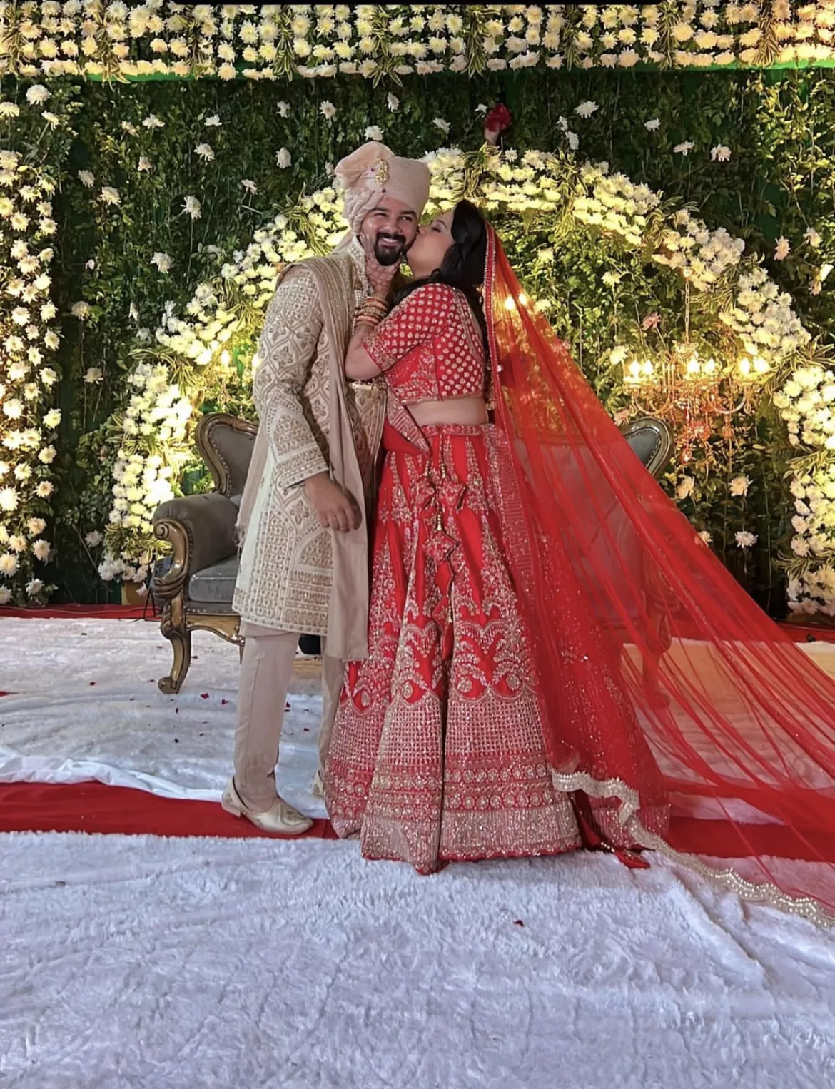 On the other hand, her groom donned an ivory-hued sherwani, featuring silver and golden embellishments. His outfit featured brocade patterns and some exquisite floral detailing. To complete his look, Saurav opted for a matching turban, a doshala and a pair of embellished juttis. In one of the pictures, shared by Sarah, she could be seen giving a sweet peck of love to Saurav as the duo was standing on the stage.