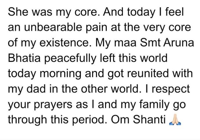 On September 8, 2021, Akshay had taken to his Twitter handle and, with a heavy heart, announced his mother's demise. Akshay had tweeted, "She was my core. And today I feel an unbearable pain at the very core of my existence. My maa Smt Aruna Bhatia peacefully left this world today morning and got reunited with my dad in the other world. I respect your prayers as I and my family go through this period. Om Shanti."