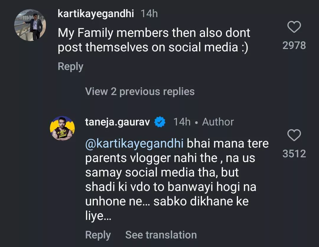 As soon as the post made rounds on social media, netizens rushed to the comment section and shared their opinions. While some of the users wished the couple well, a few of them mocked the duo and called it a mere PR stunt. Taking a dig at Gaurav's caption, one user claimed that parents don't share their problems, which is fine, but their lives aren't out there on social media, just like the YouTuber and his wife. His comment reads, "My Family members then also don't post themselves on social media." Hitting back at the netizen, Gaurav replied: