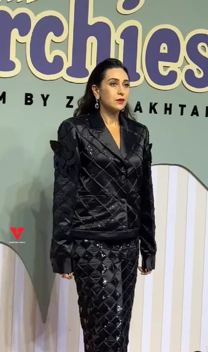 On December 5, 2023, Karisma made a stunning appearance for the film's premiere, The Archies, which featured Suhana Khan, Agastya Nanda and Khushi Kapoor. The gorgeous actress was decked up in a crisp black look. Her outfit featured a tailored black coat with a thigh-high slit pencil skirt. She dolled up in glamourous makeup, bold red lips, and flaunted wet hair look.