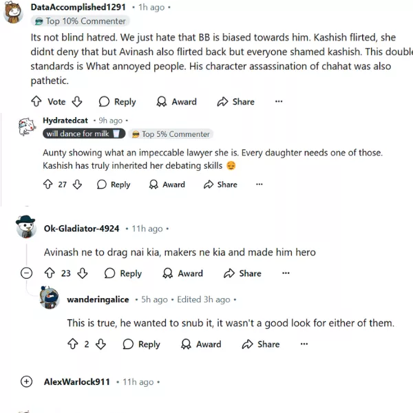 One user on Reddit commented, "Its not blind hated. We just hate that BB is biased towards him. Kashish flirted, she didnt deny that but Avinash also flirted back but everyone shamed kashish. This double standards is what annoyed people. His character assassination of desire was also pathetic." Another one wrote, "Aunty showing what an impeccable lawyer she is. Every daughter needs one of those. Kashish has truly inherited her debating skills."