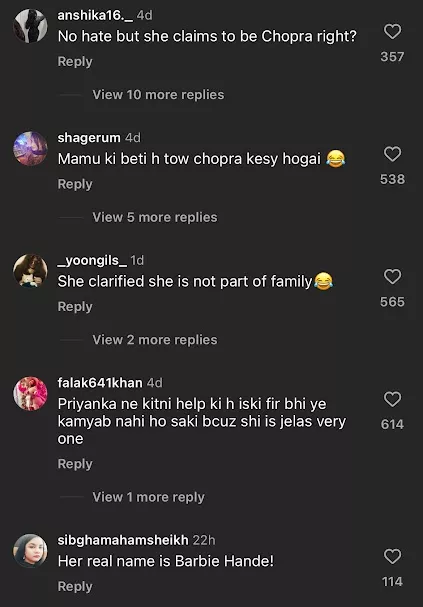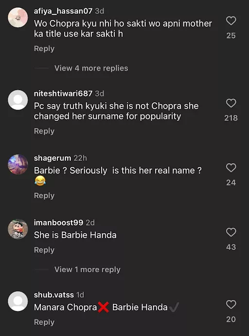 For the unversed, Mannara's mother is Priyanka and Parineeti's aunt from their paternal side. As soon as the video surfaced online, netizens flooded the comment section with their reactions. While some were shocked to learn that Mannara is not a part of the Chopra family, others mentioned that the actress's real name is Barbie Handa. A user penned, "No hate but she claims to be Chopra right?" Another one wrote, "Her real name is Barbie Handa!" Meanwhile, a netizen commented, "PC say truth kyuki she is not Chopra she changed her surname for popularity."