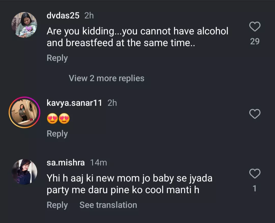 One comment read: "Hey, this is a very wrong message you are sending to others. It's not only when you are pumping; when you are breastfeeding mom, you should leave alcohol and related things. And by chance, if you want to drink anytime, which is not suggested, you should not breastfeed till 24 hours. Please at least think about the baby. The doctor also advised the same."