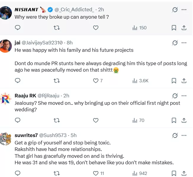 "Get a grip of yourself and stop being toxic. Rakshith have had more relationships. That girl has gracefully moved on and is thriving. He was 31 and she was 19, don't behave like you don't make mistakes. Rakshith shetty is least bothered about a cheater, don't worry guys. they broke up in 2018 bro..its being 8years. Everyone moves on..you should too. They broke up in 2018 bro..its being 8years. Everyone moves on..you should too. He is lucky escaped from her."