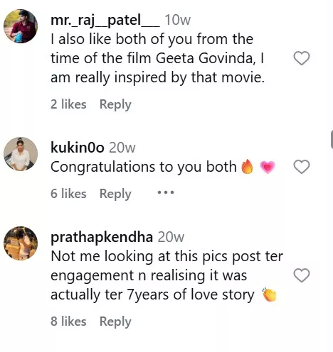 Netizens in the comments section wrote, "Have watched this movie more than 10 times and scenes ‘n no. of times, close to heart movie, forever. One of the favourite films I have seen 20 times, every time it hits like the first time. There is no scene to skip a second in this film." Another user wrote, "I also like both of you from the time of the film Geeta Govinda, that movie really inspires me. Not me looking at these pics post their engagement and realising it was actually a 7-year love story." A third user wrote: