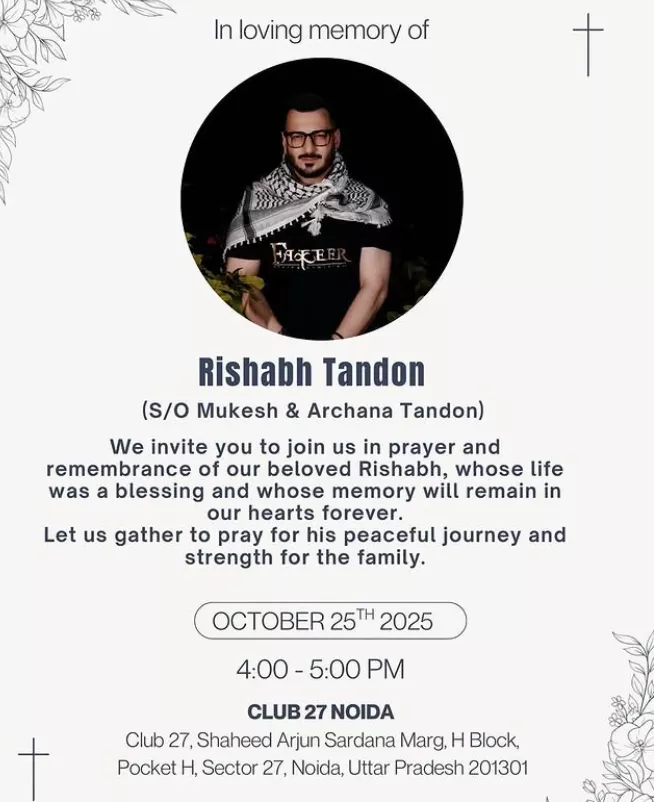 Another post about the prayer meeting of the late singer was posted. The prayer meet will take place on October 25, 2025, from 4-5 p.m. at Cumb 27, Noida. Rishabh was a well-known artist who contributed to Rashna: The Ray of Light, Faqeer- Living Limitless (2017), and Rishabh Tandon: Ishq Fakeerana (2025). He started his career with the release of his album Phir Se Wahi by T-Series in 2008.