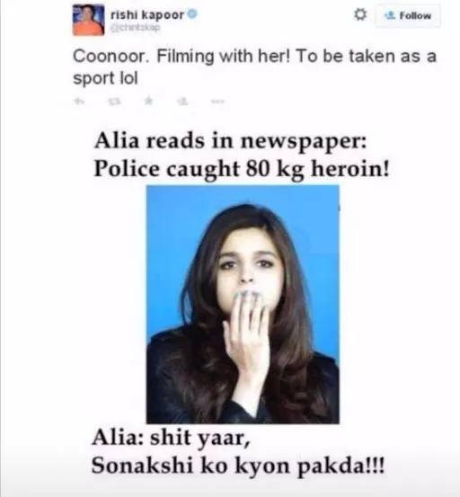 Recently, we stumbled upon an old tweet from Rishi Kapoor, wherein he talked about his experience of working with Alia Bhatt. The late actor shared that it was a sport shooting with Alia. However, it was the post, along with the tweet, that grabbed everyone's attention. Rishi Kapoor apparently fat-shamed actress, Sonakshi Sinha in the post. Taking a dig at Alia's low IQ, Rishi shared a joke, which can be read as: