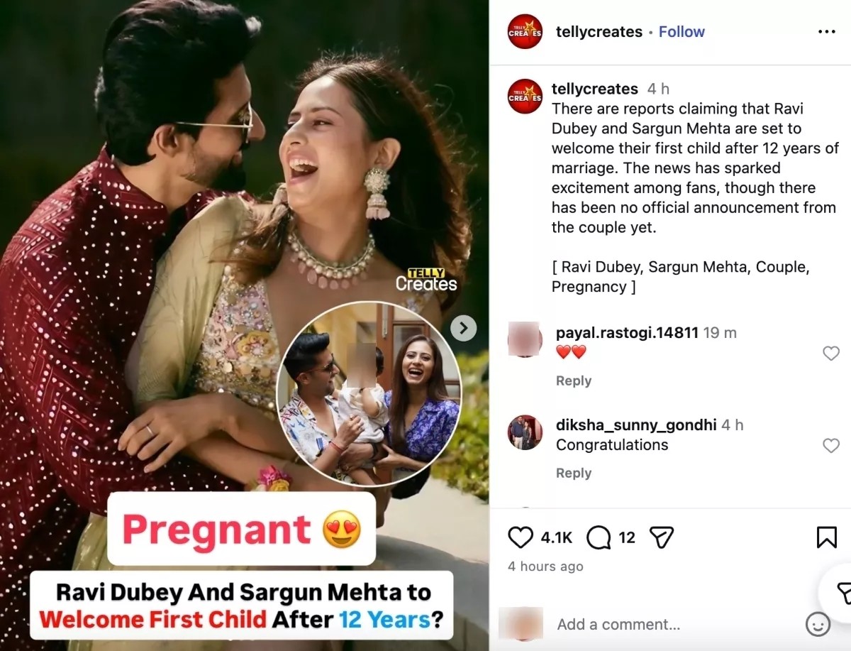If reports are to be believed, Ravi Dubey and Sargun Mehta are all set to welcome their first child after 12 years of marriage. The reports have been shared by Telly Creats. However, the couple has not made any official announcement about the same. Also, it is worth noting that BollywoodShaadis cannot verify the truth behind the post. It can be just a buzz, but so far, Sargun's name has never been dragged into any pregnancy rumours. Also, the couple likes to keep their personal life private, so it might be that they won't share much about the news, if it is true.