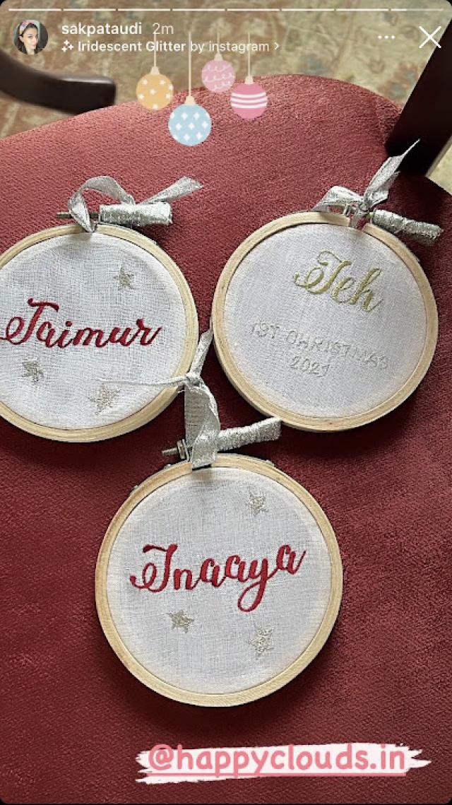 Soha Ali Khan had been giving small glimpses from her Christmas decorations. And on December 15, 2021, Soha Ali Khan had shared a picture of Christmas décoration on her IG stories that she had received for her daughter, Inaaya Naumi Kemmu, and nephews, Taimur Ali Khan and Jehangir Ali Khan. The ornaments had their names written on them. And, on one of the wall hangings, we could see ‘Jeh 1st Christmas 2021’ hand-embroidered over it.