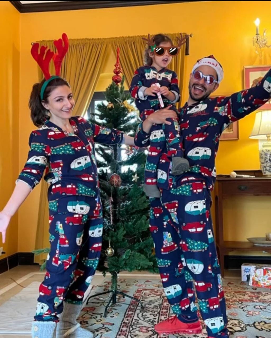 A few moments back, Soha took to her IG handle and shared a few pictures from their Christmas celebration, and the pictures are all about family, fun and Christmas vibes. In one picture, Soha and Kunal posed with their daughter in matching PJs in front of a Christmas tree wearing Rudolf headgear. While on the other, Sharmila Tagore posed with them. Along with it, Soha wrote in the caption: