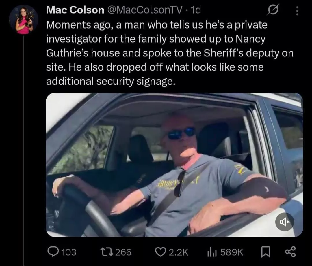 Nancy Guthrie's case is being investigated by multiple agencies, led by the Pima County Sheriff's Department, with significant assistance from the FBI, U.S. Customs and Border Protection, and search-and-rescue teams. Amidst that, the public spotted a tall guy with a big build outside Nancy's house. An X user shared his video, referring to him as the Guthrie family's hired private investigator (PI). "Moments ago, a man who tells us he's a private investigator for the family showed up at Nancy Guthrie's house and spoke to the Sheriff's deputy on site. He also dropped off what looks like some additional security signage," the post read.