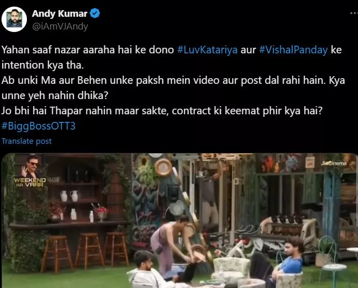 Andy Kumar, also known as VJ Andy, took to his X (Previously Twitter) and shared a video wherein Vishal and Armaan could be seen talking about Kritika as she was in gym wear. In the video, Vishal said Armaan is lucky. Lovekesh then observed Kritika and told Vishal that he knew why he had called Armaan 'lucky'. Sharing the video, Andy wrote that the video clearly showcases what kind of intentions Vishal and Lovekesh harbour. He also questioned if Vishal's family members hadn't watched the clip.